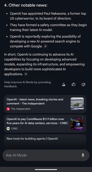 In AI Mode, Google does the searching for me to give me a summary of the latest news, which is quite different.