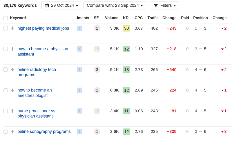 I compared keyword rankings today (October 29) to September 23 in Ahrefs. The first thing I noticed was that many top keywords have held their rankings or improved.