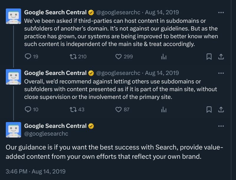 In Glenn Gabe’s most recent article, he wrote about sites that were possible targets for abusing Google’s site reputation abuse policy were seeing declines. Google responded saying that this was not the case, but rather, their systems “aim to understand if a section of a site is independent or starkly different from the main content of the site.”