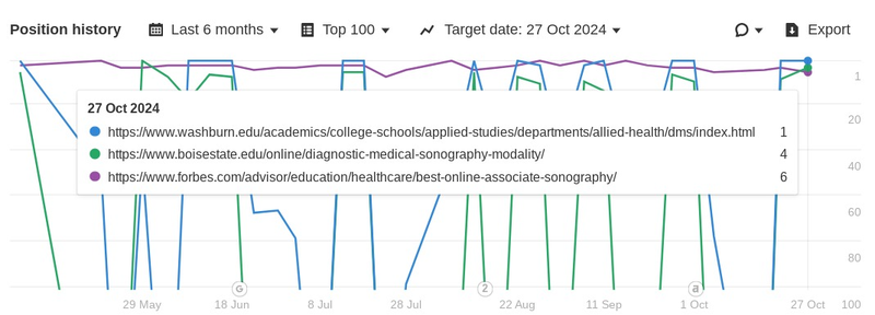 The search term online sonography programs does not trigger an AIO. We can see that Forbes (purple) has been overtaken by organizations that offer sonography programs including Washburn.edu and Boisestate.edu.