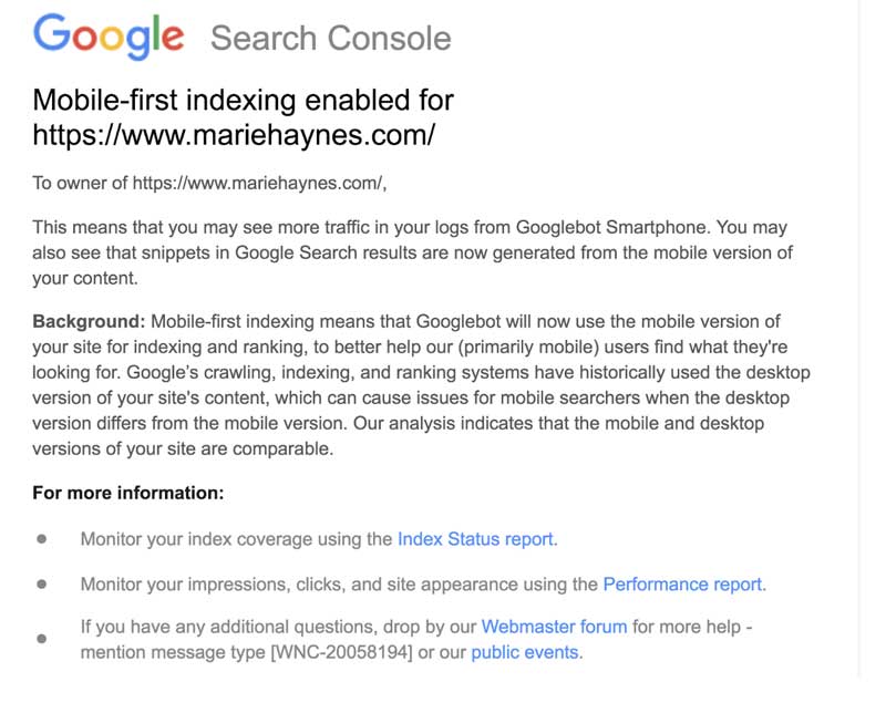 - Email – As seen above, Google will initially alert you with an email saying that your property has been transitioned to mobile-first. Emails can often be missed though, so thankfully there are a number of other alternatives that are easy to access. If you have gotten the email, it is likely that the transition to mobile-first indexing happened days or even up to two weeks prior.