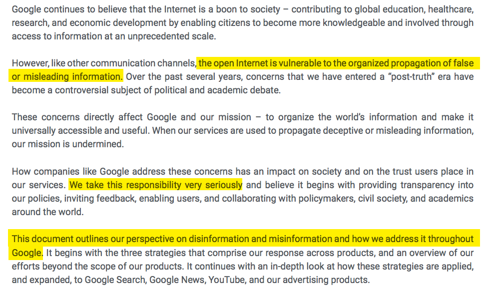 Google tells us in this document what one of their main weapons is against fighting disinformation. This was the first mention outside of the QRG of the concept of E-A-T: Expertise, Authoritativeness and Trustworthiness being approximated by Google focusing on measurable signals. E-A-T, now E-E-A-T is Google’s weapon to fight against disinformation!