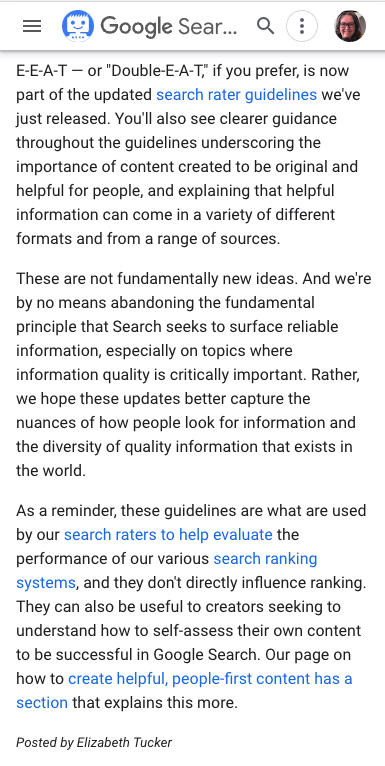 I do have to differ with Kevin on one particular point. He sys that Google did not once mention E-A-T in their new search systems guide. The helpful content system documentation links to information on creating content that the helpful content system is designed to find helpful. They give us questions to use to self assess our site such as “Is this content written by an expert or enthusiast who demonstrably knows the topic well?” or “Does your content clearly demonstrate first-hand expertise and a depth of knowledge (for example, expertise that comes from having actually used a product or service, or visiting a place)?”, questions clearly related to E-A-T. They end this document with information telling us how important E-A-T is.
