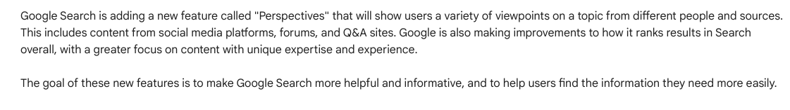 I touched on this briefly last week as we discussed Google’s blog post on perspectives. Perspectives, like featured snippets showing different people’s opinions or views on a topic, have existed in News results, but soon will be shown for non-news queries as well. The new update will help find “hidden gems” amongst more well known sites.