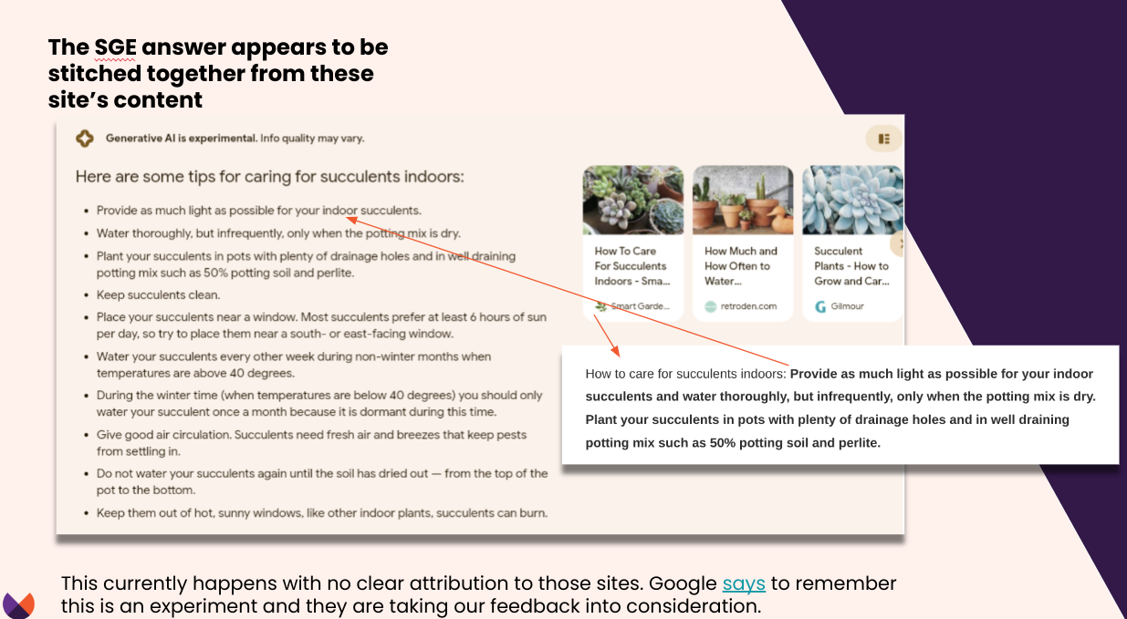 However, the SGE seems to be not generating its own text, but rather, weaving together pieces of indexed information, taken from websites, into coherent and helpful responses. There’s no attribution to specific websites used to make this answer.