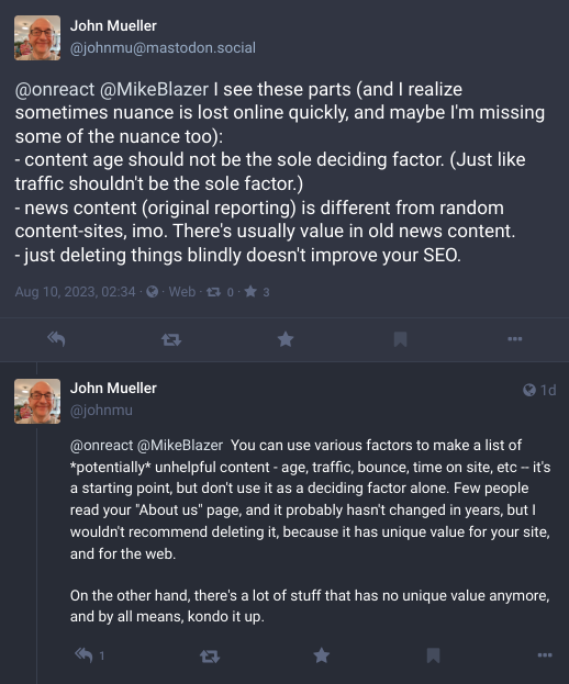 On Mastodon, John Mueller added more thoughts on content pruning: