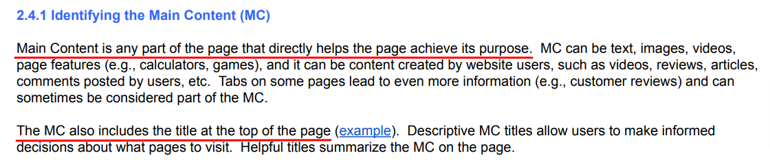The main content is the part or parts of the page that answer the question that prompted the searcher to pick up their phone or open their computer and do a search.