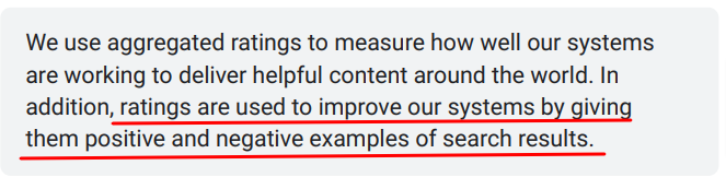 These ratings are used by Google to refine machine learning algorithms designed to surface pages that users are likely to find helpful. Those systems learn by looking at many examples of results that a searcher would find helpful and also ones that are not helpful. Again, I’ve written a whole bunch more on this in my article about the helpful content system.