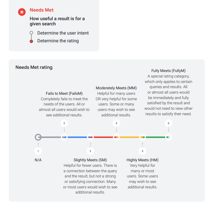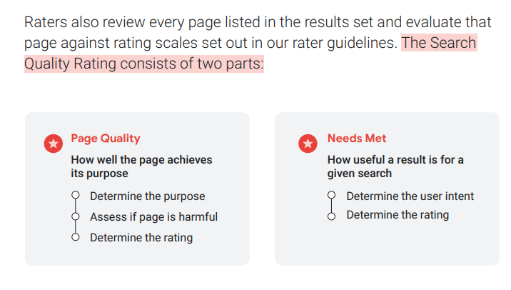 Raters also score each page on the search result on scales measuring page quality (E-E-A-T) and how fully the page meets the searcher's needs.