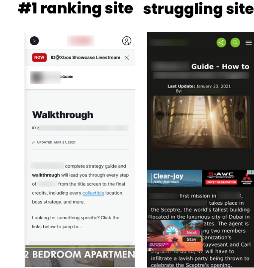 The site on the left certainly looks more likely to be helpful for someone who is looking for a game walkthrough. The page on the right is a good site, but there are a few things that Google’s guidance on quality content mention as things to consider. In this case, I expect the most important parts come from Google’s documentation on providing a good page experience, which is all a part of helpfulness.